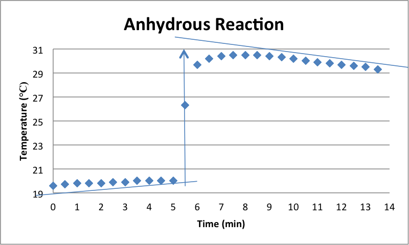First, one sample of anhydrous, between 7 and 8 grams, and one sample of hydrate, between 15.3 and 15.4 grams, were measured out to four significant figures. Then, a weighed polystyrene cup was obtained and filled with 100 mL of distilled water. The thermometer attached to the Palm Pilot was then placed in the water and allowed to obtain measurements for 5 minutes. After five minutes, the anhydrous was rapidly added to the water, which was constantly being stirred, and allowed to react for an additional 8 minutes, or until the temperature became pretty constant. The Palm Pilot recorded the temperature every thirty seconds during this time period. The same process was repeated with the hydrate, using new distilled water.