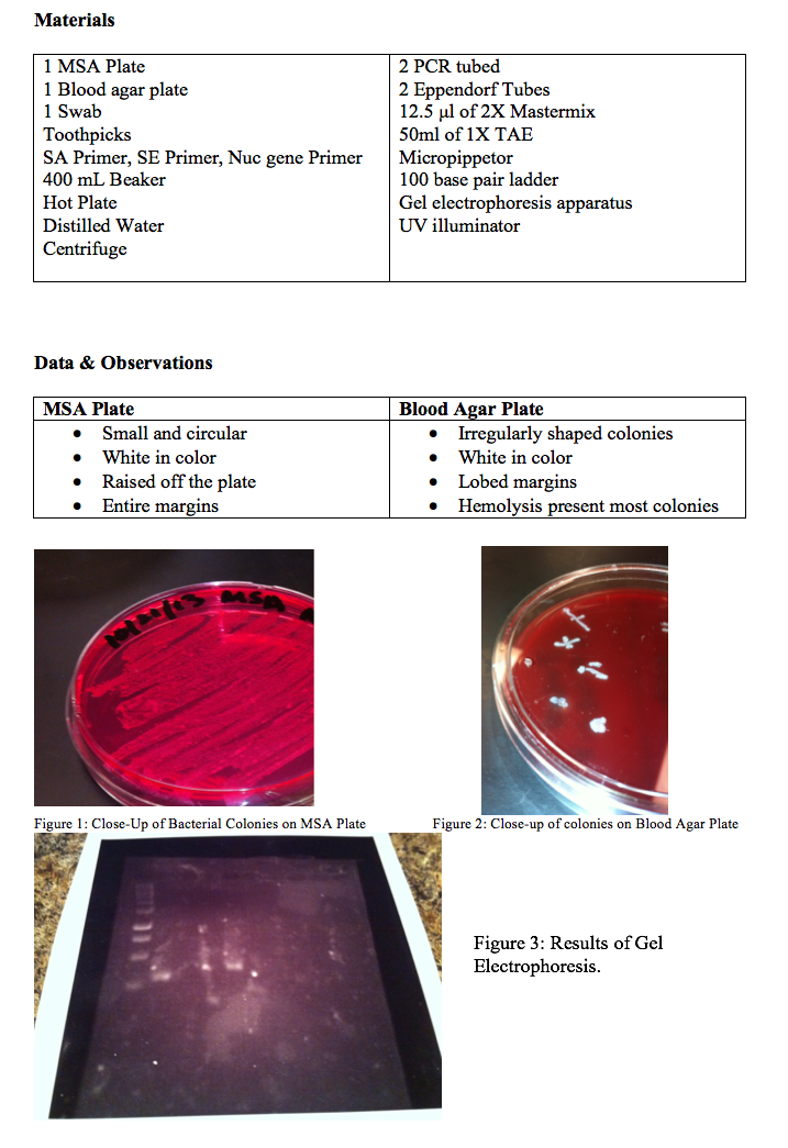 The experiment began by swabbing the inside of our nose and plate it onto a mannitol salt agar plate. The plate was then incubated and given to us during the next lab. Five to ten colonies were then removed from the plate with a toothpick and placed on blood agar plates and allowed to incubate. Then we removed another colony from the MSA plate and set up two PCR reactions. This began by suspending the colony in 50ul of water within an Eppendorf Tube and incubating the tube by placing in boiling water within a 400 ml beaker with foil covering the top. This was done for approximately five minutes and then immediately after we centrifuged the tube at 1300 RPM for approximately ten minutes. Next we obtained two PCR tubes, one was set up with SE primer set and the other was either SA specific primer set if the reaction was positive for mannitol or with the nuc gene if it was negative for mannitol. The following amounts were put into each tube; 7 μl of the supernatant fluid from the centrifuged tubed, 12.5 μl of 2X Mastermix that we had sit on ice and 5.5 μl of the appropriate primer mix. The next step was to amplify the mixture. This was achieved by denaturing for eight minutes at 95°C then one minute at 94°C next 30 seconds at 51 – 54°C and finally 90 seconds at 72°C. Lastly we prepared the 2% agarose gel. This followed by loading the 100 base pair ladder in well #1 and loading the PCR products in the following wells. Finally we ran the gel electrophoresis at 120 V for 40-45 minutes and checked the results under a UV illuminator.