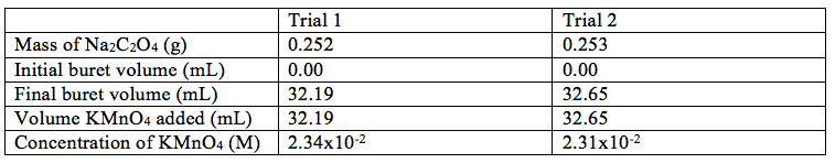 Table 2. The measurements and calculations necessary to calculate the molarity of the KMnO4 standard